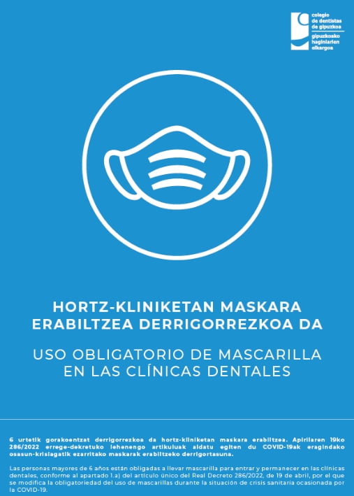 En relación a la obligatoriedad del uso de mascarillas en los centros dentales, desde el Colegio, se ha preparado este diseño para aquellas clínicas que deseen informar de esa obligatoriedad.