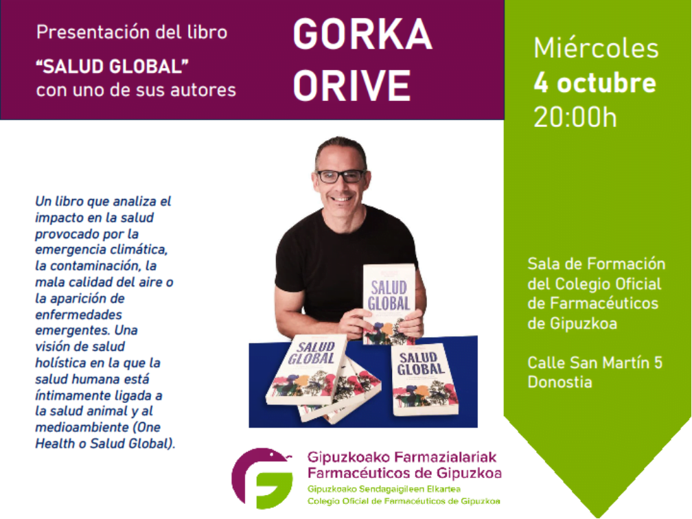 «Mediante este correo, tenemos el placer de invitar a tod@s l@s colegiad@s de ese Colegio, a la presentación del libro “SALUD GLOBAL” con uno de sus autores, D. Gorka Orive (Doctor en Farmacia e investigador. Profesor Titular de Farmacia y Tecnología Farmacéutica en la UPV/EHU), que hemos organizado para el 4 de octubre a las 20:00h. en nuestra sala de formación (C/ San Martín, 5), con motivo del 125 aniversario del Colegio Oficial de Farmacéuticos de Gipuzkoa.Esperando sea de su interés, les esperamos en la presentación.Un cordial saludo.»